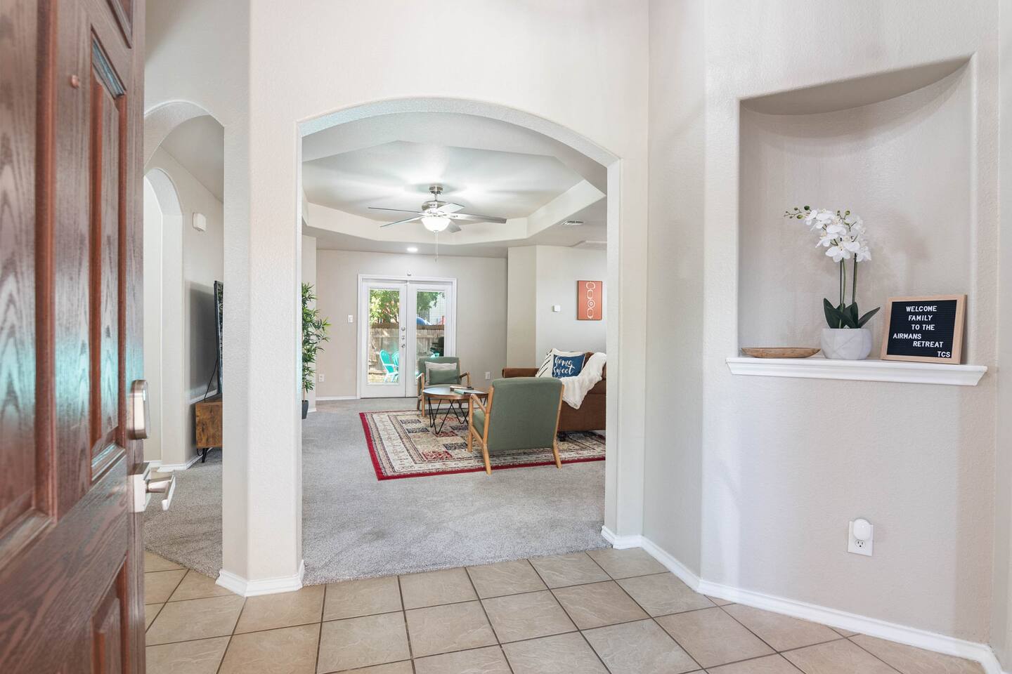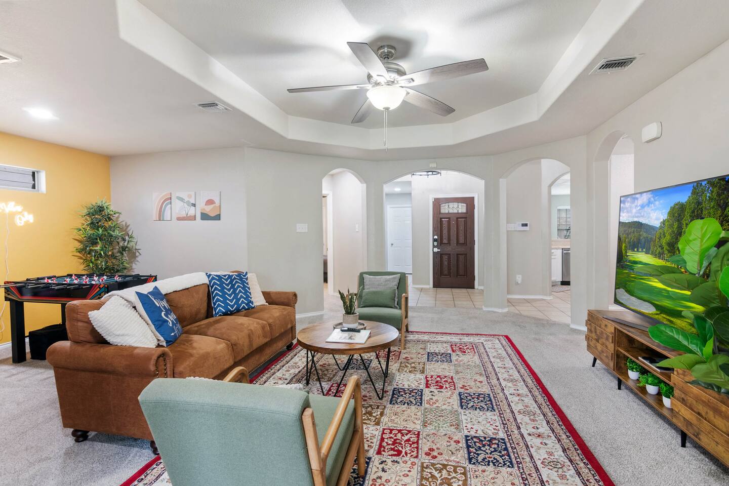 Step inside this clean, modern, and inviting single-level home, designed for comfort and connection. The open-concept living area is perfect for relaxing after a day of exploring and flows directly into a fun game area complete with a foosball table. The fully-equipped kitchen has everything you need to prepare delicious family meals, which can be enjoyed in one of two dining areas. Sleeping arrangements comfortably accommodate up to 8 guests: * Bedroom 1: King Bed * Bedroom 2: Queen Bed * Bedroom 3: Twin Bunk Bed * Additional: One Twin rollaway bed & one twin foldable futon All bedrooms feature room-darkening shades to ensure a restful night's sleep. This home is perfect for families and working professionals: * Dedicated Workspace: A desk with an Ethernet connection provides a reliable spot for remote work. * Family-Friendly Amenities: We provide a Pack 'n play, high chair, child-friendly dinnerware, outlet covers, and table corner guards. * Private Backyard Oasis: Your private, fenced-in backyard features a BBQ grill, a fire pit for evening stories, and a comfortable seating area.